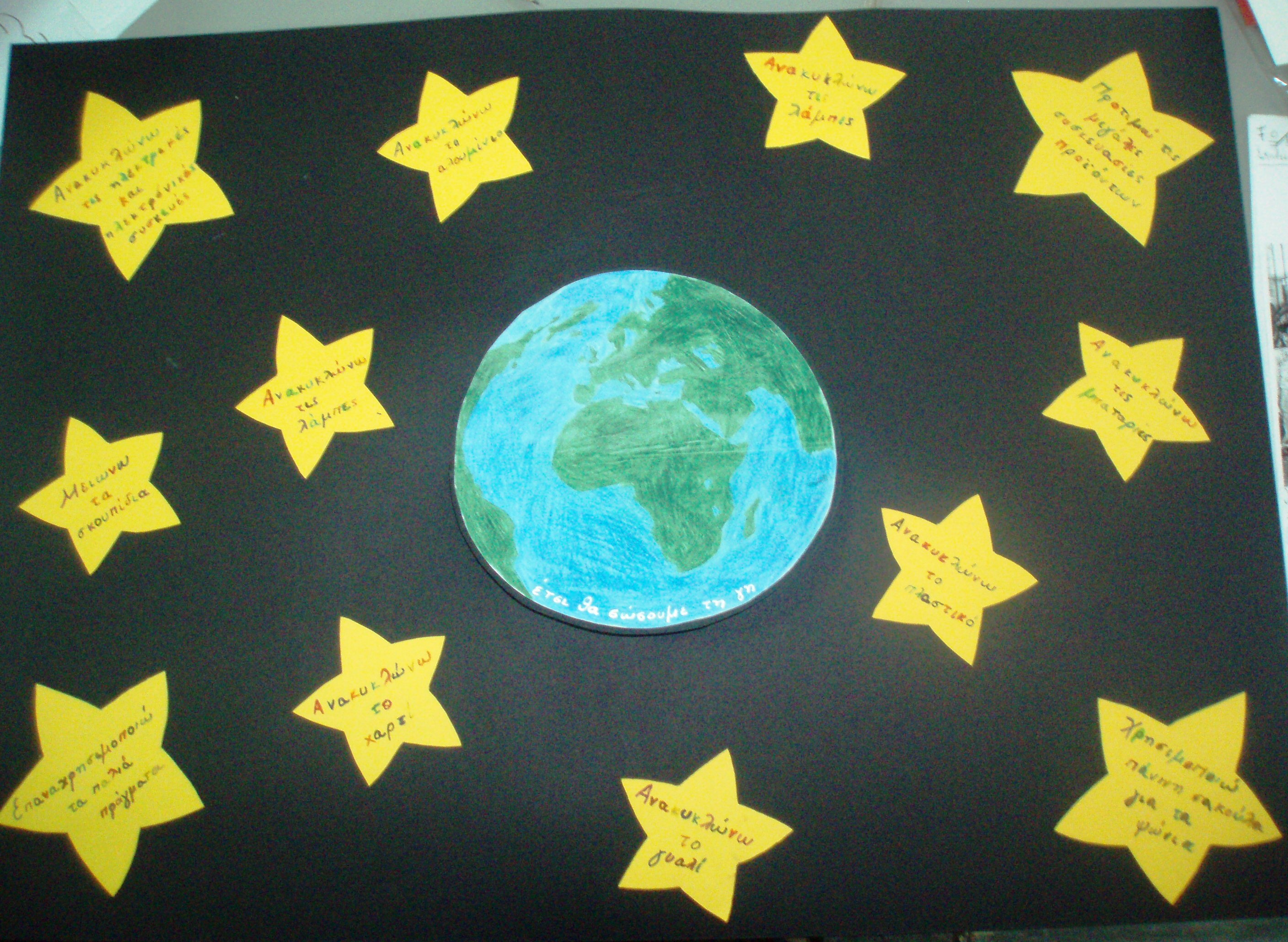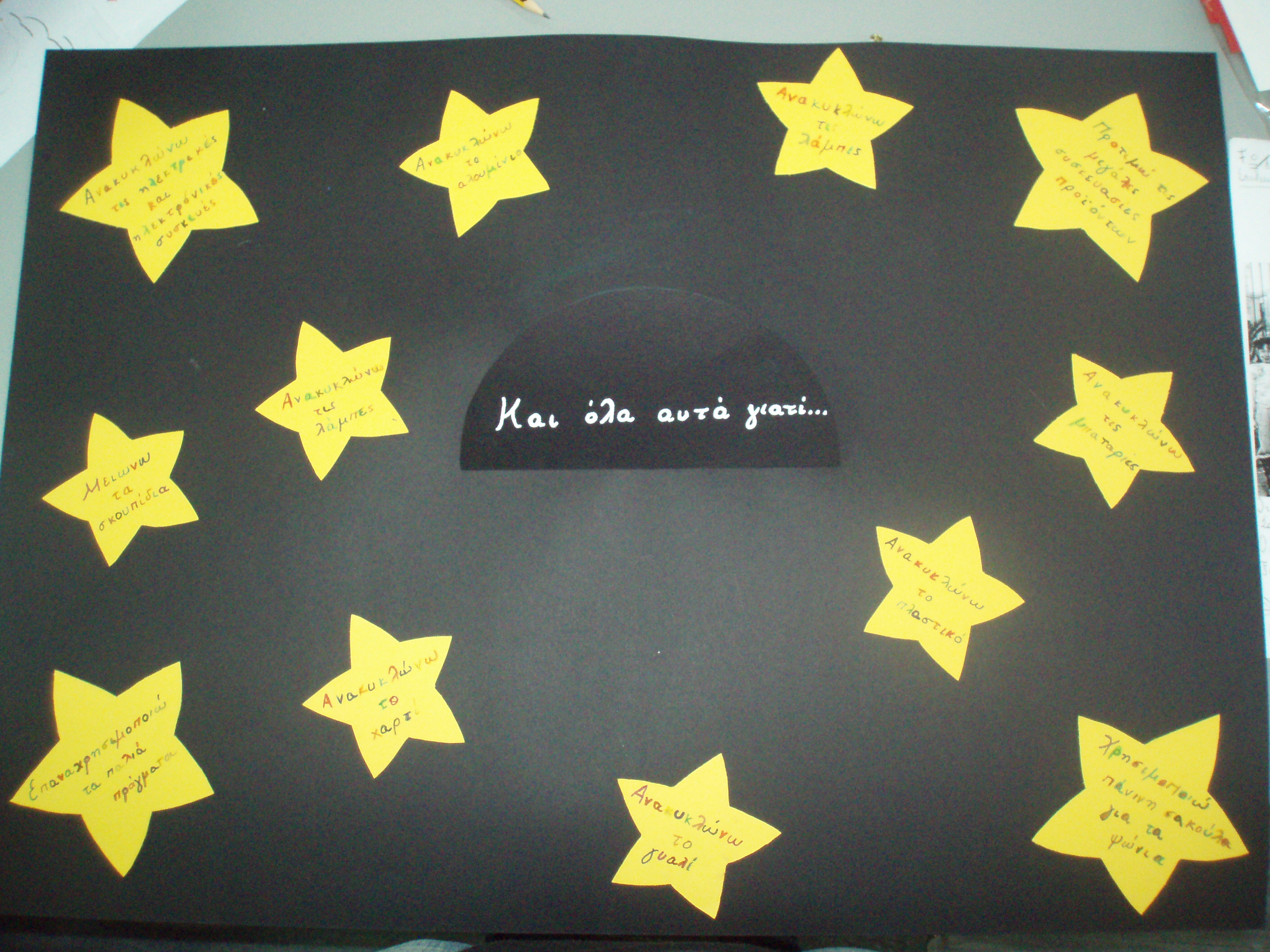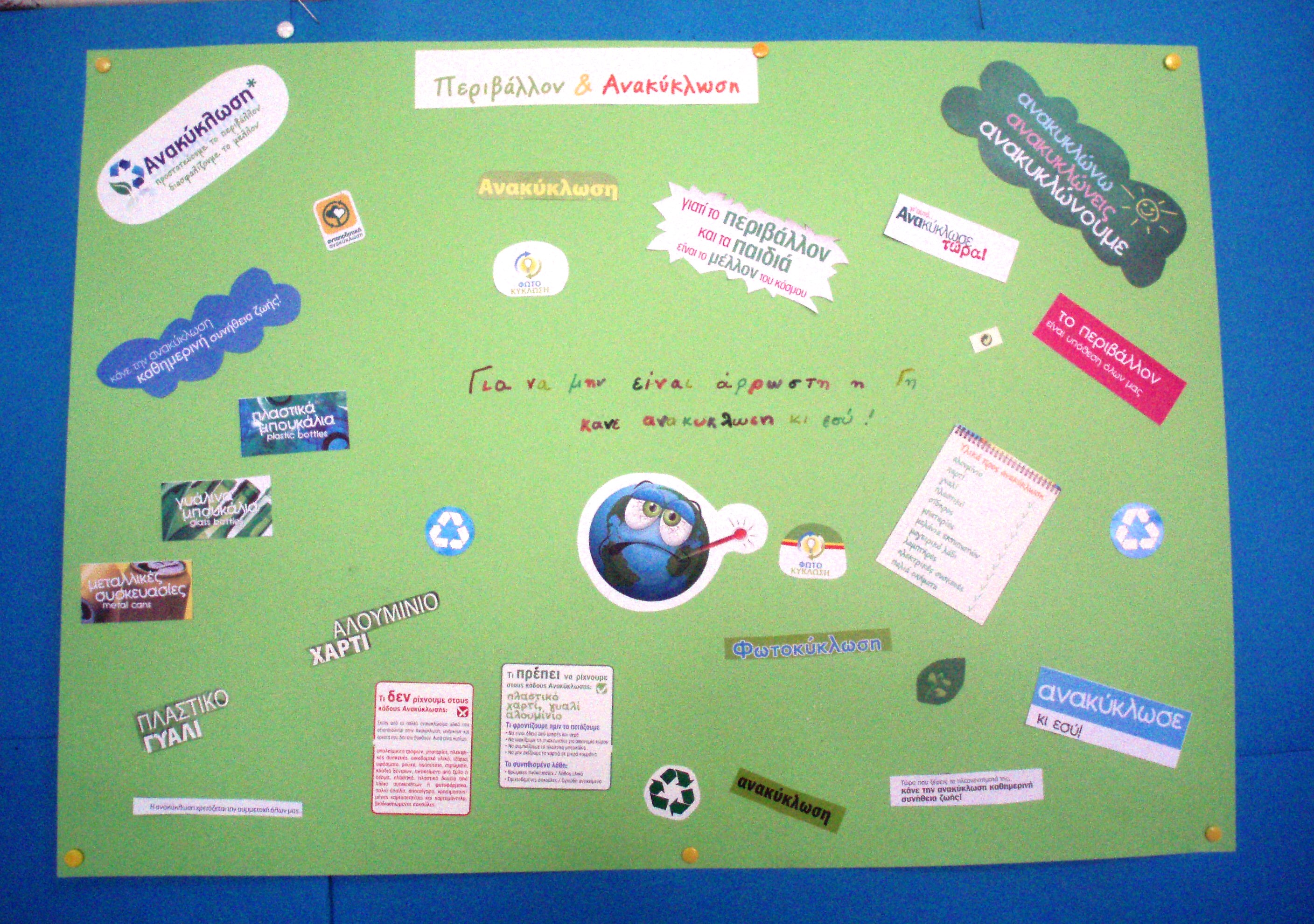Στα πλαίσια του μαθήματος της Ευέλικτης Ζώνης ασχοληθήκαμε με το ζήτημα της ανακύκλωσης πραγματοποιώντας διάφορες δραστηριότητες. Μία από αυτές ήταν να δημιουργήσουμε αφίσες με σκοπό την ευαισθητοποίηση των πολιτών. Η πρωτη αφίσα που παρουσιάζεται εκτέθηκε στο Φεστιβάλ "Athens in acton" που πραγματοποιήθηκε τον Ιούνιο του 2009 στο Ζάππειο.