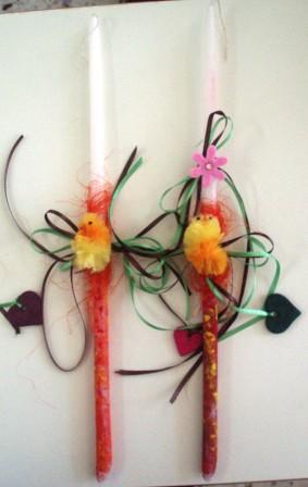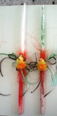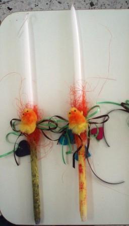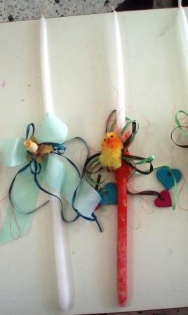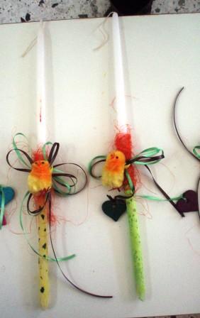 - για τις λαμπάδες: Κεριά - λαμπάδες, νερομπογιές, κορδέλες, διακοσμητικά στολίδια.