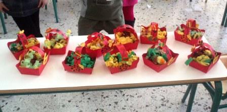 - για τα καλαθάκια: Κόκκινα χαρτόνια - πατρόν, κίτρινα χαρτόνια, ψαλίδια, συρραπτικό, πράσινο γκοφρέ χαρτί, ποτ πουρί
