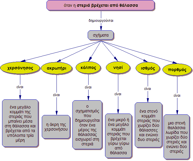 - Βρες στο λεξικό τη σημασία των παρακάτω γεωγραφικών όρων: χερσόνησος, ακρωτήριο, νησί, κόλπος, πορθμός, ισθμός, διώρυγα. Μπορείς να κοιτάξεις και στο ηλεκτρονικό λεξικό.